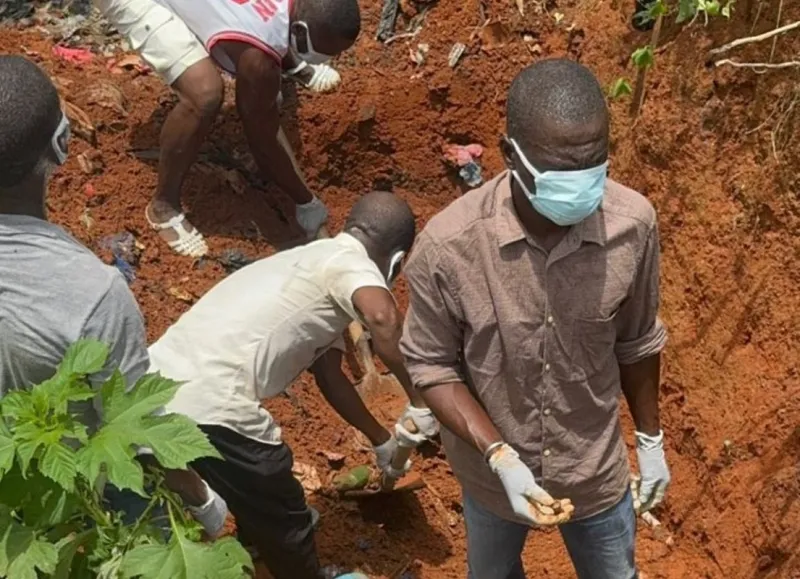 Ce mardi 9 septembre 2025, en plein jour, les autorités judiciaires et policières se rendent sur les lieux indiqués par le suspect. Sous un soleil de plomb, l’opération d’exhumation est menée en présence du juge d’instruction Yoro, de l’officier enquêteur Diaby Ibrahima et du substitut du Procureur de la République, Diahi Célestin.