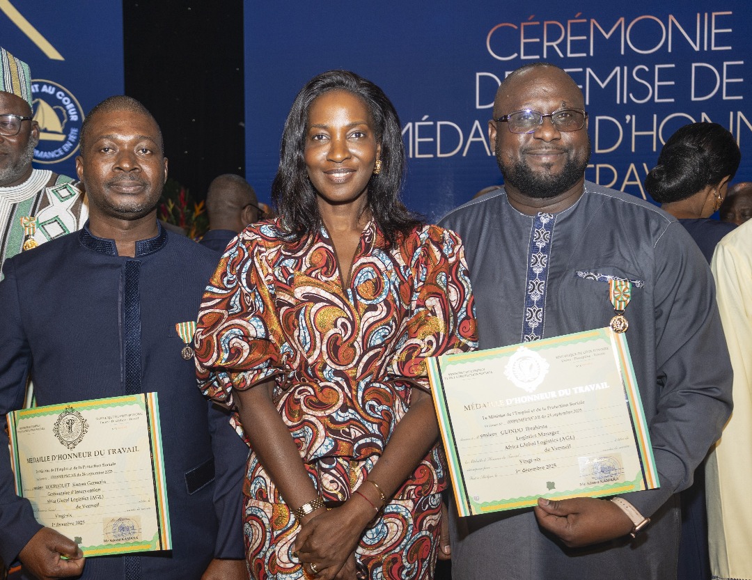Abidjan, 12 décembre 2025 – AGL Côte d’Ivoire a procédé, le jeudi 12 décembre 2025, à une importante cérémonie de décoration de ses collaborateurs au Sofitel Hôtel Ivoire d’Abidjan. À l’occasion de cet événement solennel, 442 employés de l’entreprise ont reçu la Médaille d’Honneur du Travail, en présence du ministre de l’Emploi et de la Protection sociale, Me Adama Kamara.